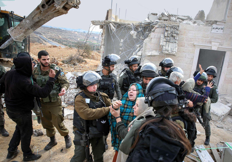 Israelische Streitkräfte stehen Wache, während palästinensische Frauen auf den Abriss ihres Hauses in der "Area C" im Westjordanland in der Stadt Hebron reagieren, 28. Dezember 2021. (Wisam Hashlamoun/Flash90)