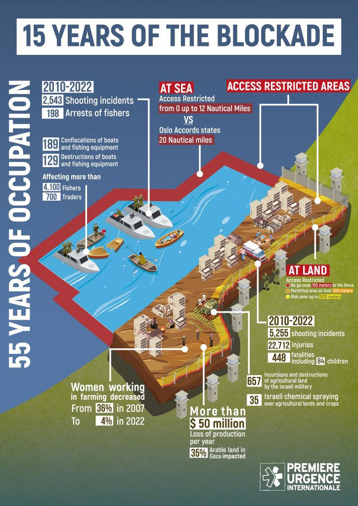 Neben der Blockade des Gazastreifens haben die israelischen Behörden einseitig Sperrzonen auf dem Land und im Meer verhängt. Diese Zonen stellen jedoch den Nahrungsmittelkorb des Gazastreifens dar. Je nach politischer Lage dürfen die Fischer zwischen 0 und 12 Seemeilen fahren, während ihnen im Oslo-Abkommen bis zu 20 Seemeilen zugestanden wurden. Selbst in den erlaubten Gebieten schießt die israelische Kriegsmarine weiterhin mit scharfer Munition auf die Fischer, nimmt sie fest und/oder beschlagnahmt oder zerstört ihre Boote und Fischereiausrüstung. Zwischen 2010 und 2022 wurden mehr als 4000 Fischer von den israelischen Maßnahmen hart getroffen. Diese Verletzungen der Menschenrechte und des humanitären Völkerrechts haben äußerst negative Auswirkungen auf den Lebensunterhalt der Fischer und ihrer Familien sowie auf die Wirtschaft des Gazastreifens, die aufgrund der Blockade bereits sehr angeschlagen ist.