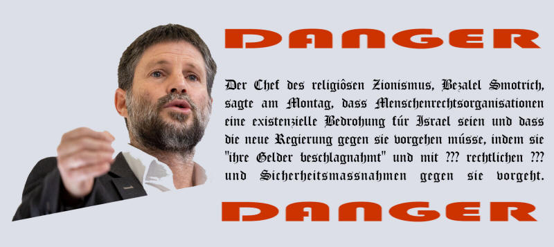 Der Chef des religiösen Zionismus, Bezalel Smotrich, sagte am Montag, dass Menschenrechtsorganisationen eine existenzielle Bedrohung für Israel seien und dass die neue Regierung gegen sie vorgehen müsse, indem sie "ihre Gelder beschlagnahmt" und mit rechtlichen und Sicherheitsmaßnahmen gegen sie vorgeht.