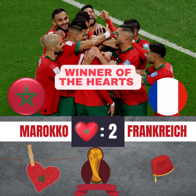 Das Spiel ist gelaufen, der Traum vom unaufhaltsamen Aufstieg der Marokkaner in der WM-Spitzenklasse ist aus, nach der 0:2-Niederlage gegen Frankreich (siehe auch Artikel rechts und Kommentar). Für die palästinensischen Fans der „Atlas-Löwen“ ist es trotzdem Ehrensache, noch mal ihre Favoriten zu feiern. Aus den offenen Wagenfenstern wehen jede Menge Wimpel und Fahnen in Rot mit grünem Stern, den marokkanischen Nationalfarben, als sich nach dem Abpfiff ein spontaner Autokorso hupend in Richtung Jerusalemer Damaskustor schiebt. Die Spieler Marokkos bleiben die Helden palästinensischer Herzen.