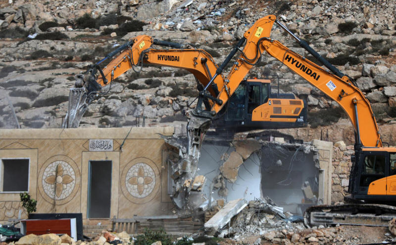 Das israelische Militär setzt Bagger ein, um am 28. November zwei palästinensische Häuser in der Gegend von Jabal Johar in der Nähe der israelischen Siedlung Kiryat Arba im Westjordanland zu zerstören.