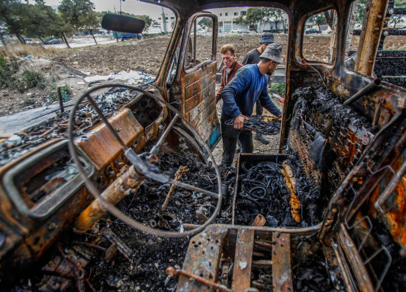 Palästinenser inspizieren einen mit Zitrusfrüchten beladenen Lastwagen, der von jüdischen Siedlern während eines Angriffs in der Nähe der Siedlung Shavei Shomron, westlich der Stadt Nablus im Westjordanland, in Brand gesetzt wurde, nachdem ein Palästinenser am 16. November drei Israelis im und um das Industriegebiet Ariel getötet hatte.