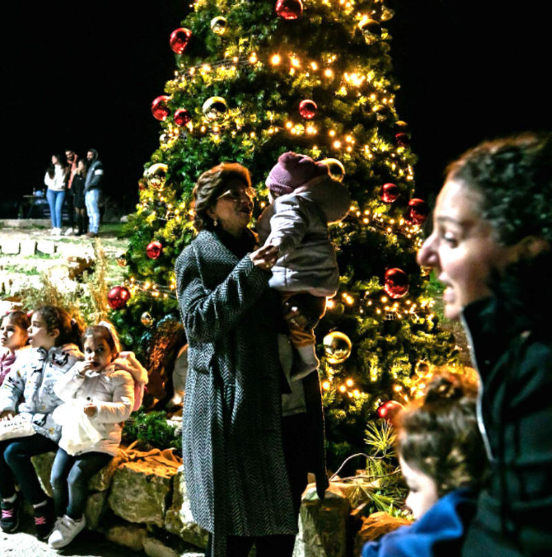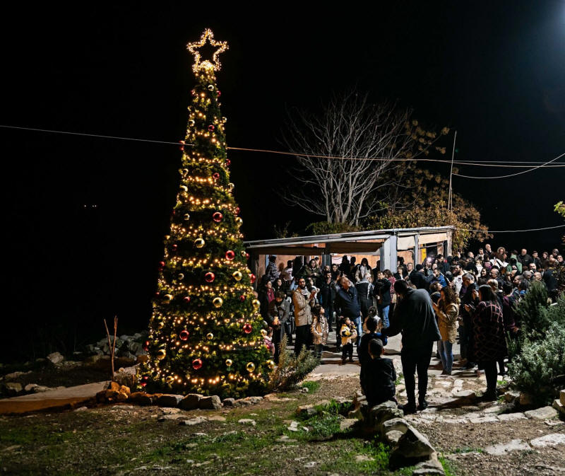 Inmitten der Kalksteinruinen der Häuser eines Dorfes, das vor langer Zeit von den israelischen Streitkräften zerstört wurde, wurde an einem Abend ein mit roten und goldenen Kugeln geschmückter Weihnachtsbaum aufgestellt, der von einer Menge ehemaliger Bewohner und deren Nachkommen beobachtet wurde.