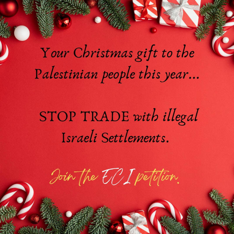Zum bevorstehenden Weihnachtsfest bitten wir Sie, die Europäische Bürgerinitiative zu unterstützen, Israel zur Verantwortung zu ziehen und den Handel mit illegalen israelischen Siedlungen, die die Rechte der Palästinenser verletzen, zu stoppen.