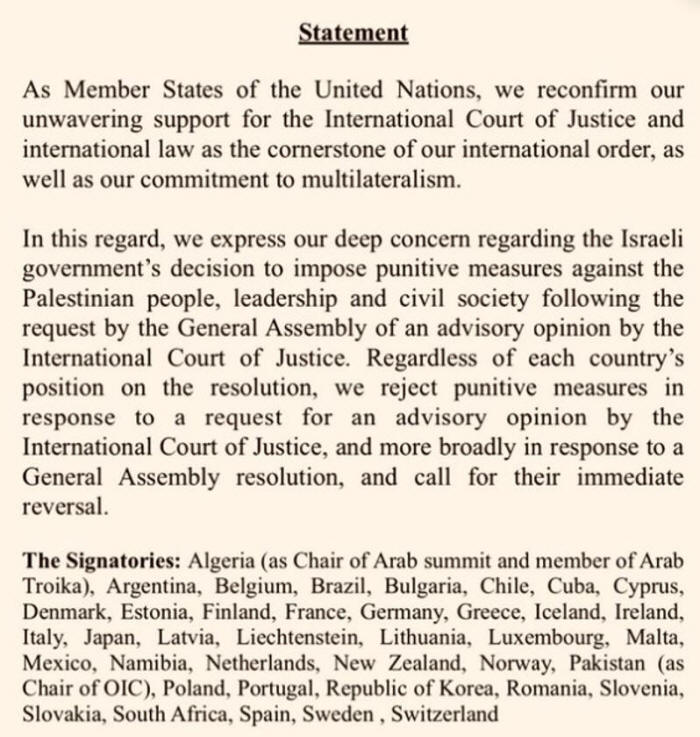 (Deutschland hat sich der großen Gruppe von UN-Mitgliedstaaten angeschlossen, die diese Erklärung unterzeichnet haben. Diese Gruppe, die unterschiedliche Auffassungen über die jüngste Resolution der Generalversammlung der Vereinten Nationen vertritt, in der ein Gutachten des IGH gefordert wird, ist sich einig in der Ablehnung von Strafmaßnahmen als Reaktion auf diese Resolution.) Quelle