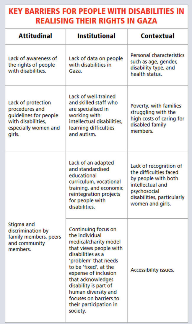 Nach Angaben des Palästinensischen Zentralbüros für Statistik haben fast 7 % der Bevölkerung des Gazastreifens eine Behinderung. Die Arbeitslosenquote unter der Gesamtbevölkerung ist mit 44 % eine der höchsten der Welt. Bei Menschen mit Behinderungen steigt diese Quote auf über 90 %. Infolgedessen sind die meisten Menschen mit Behinderungen und ihre Familien weitgehend auf humanitäre Hilfe angewiesen.