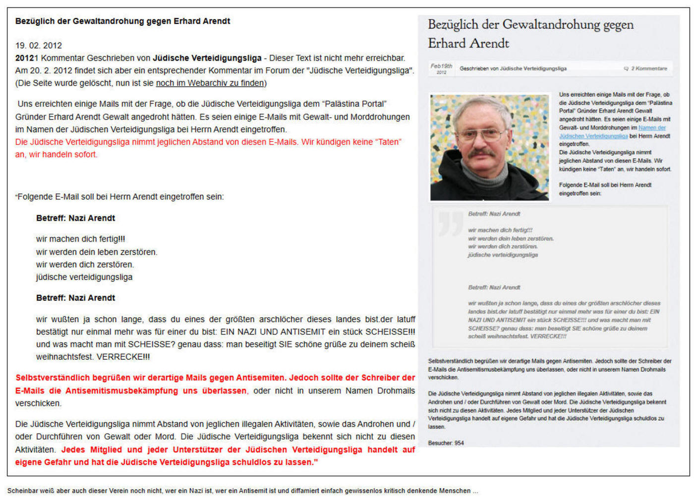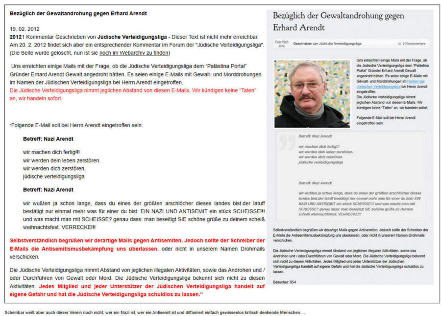 Da ich zwei Jahre lang telefonische Morddrohungen und entsprechende Mails bekam bat ich den Staatsschutz zu ermitteln. Es kann sein, dass, neben anderen Ermittlungen, die Aktivitäten der Jüdische Verteidigungsliga - Abteilung Deutschland, durch diese scheinheilige Reaktion beendet werden mussten. Ihre Internetseite ist nicht mehr zu erreichen.