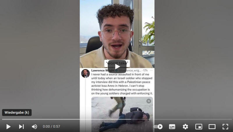 In einem weiteren Posting fügte er hinzu: "Es geht nicht um Issa Amro, sondern um die palästinensischen Frauen und Kinder, die häufig von israelischen Soldaten und Siedlern angegriffen werden. Alle Palästinenser leben unter israelischer Besatzung und Apartheid. Das Video des Angriffs erzählt die Geschichte eines jeden Palästinensers in Palästina."
