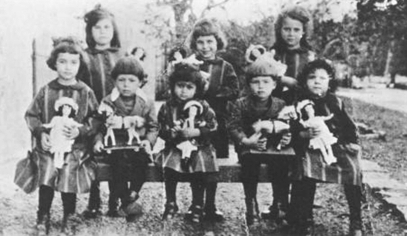 Die Kindergartenklasse an einer deutschen evangelischen Missionsschule, dem Schmidt Girls' College, Jerusalem, PALÄSTINA, 1926. Die jungen Damen auf dem Bild stammen alle aus derselben Familie, den Tajis von Wadi Hunayn, in der Nähe von Ramleh. Man beachte die symmetrische Anordnung der Spielsachen.