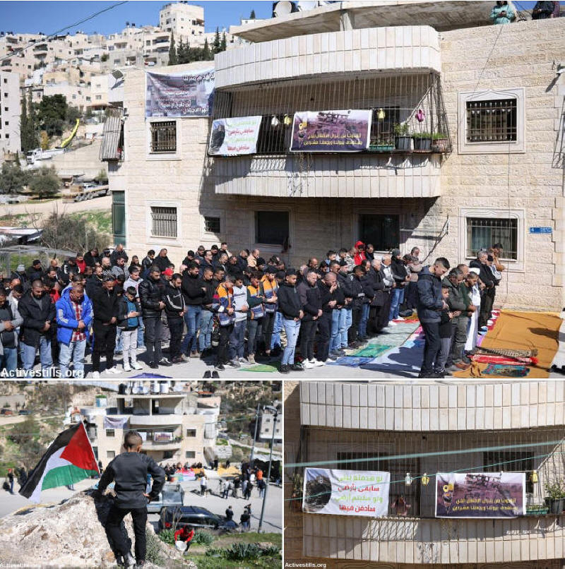 Palestinians hold Friday prayer next to a house under threat of demolition by Israeli colonial authorities in #Silwan, #Jerusalem.