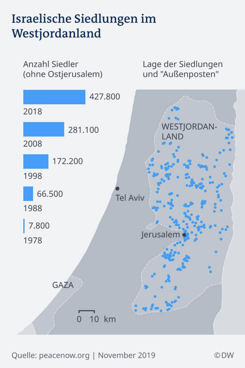Im besetzten Westjordanland leben etwa 2,9 Millionen Palästinenser sowie schätzungsweise 475.000 jüdische Siedler, die in staatlich anerkannten und nach internationalem Recht illegalen Siedlungen leben.