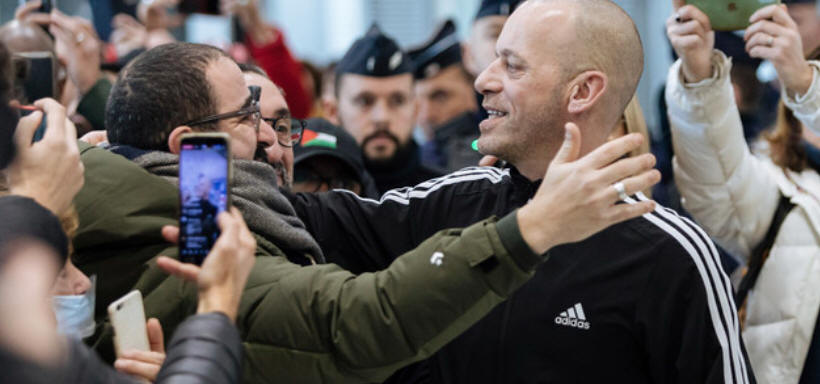 Der palästinensische französische Anwalt Salah Hammouri wird bei seiner Ankunft am Pariser Flughafen Charles de Gaulle begrüßt, nachdem er am 18. Dezember 2022 von den israelischen Besatzungsbehörden aus seiner Heimatstadt Jerusalem ausgewiesen wurde. Hammouri sieht sich nun Einschränkungen und Schikanen seitens der französischen Behörden ausgesetzt. Lewis JolyAP Photo
