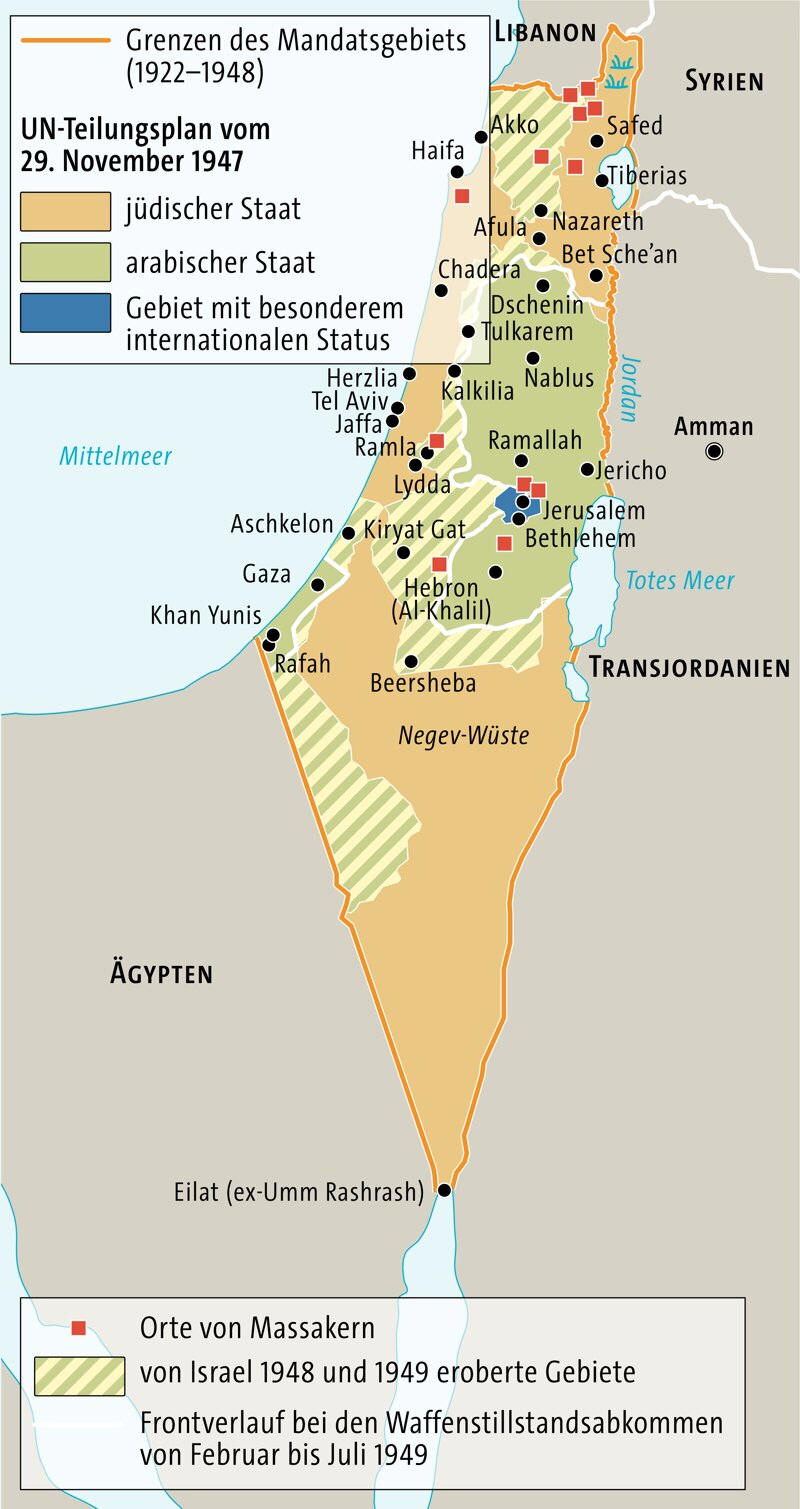 Al-Nakba, Arabisch für Katastrophe, bezeichnet das erzwungene Ende angestammter palästinensischer Existenz in jenen drei Viertel des historischen Palästinas, die zu Israel wurden. Konkret: Flucht und Vertreibung von 750 000 Männern, Frauen und Kindern zwischen Herbst 1947 und Frühling 1949. Nur im geringeren Maße war dies eine desaströse Folge des Angriffs seitens der arabischen Nachbarstaaten; vielmehr galt es, für das junge Israel strategisch zu erkämpfen, was der Teilungsplan der Vereinten Nationen gar nicht vorsah: eine eindeutige, machtvolle und haltbare jüdische Mehrheit im künftigen Staat (siehe den nebenstehenden Kasten).