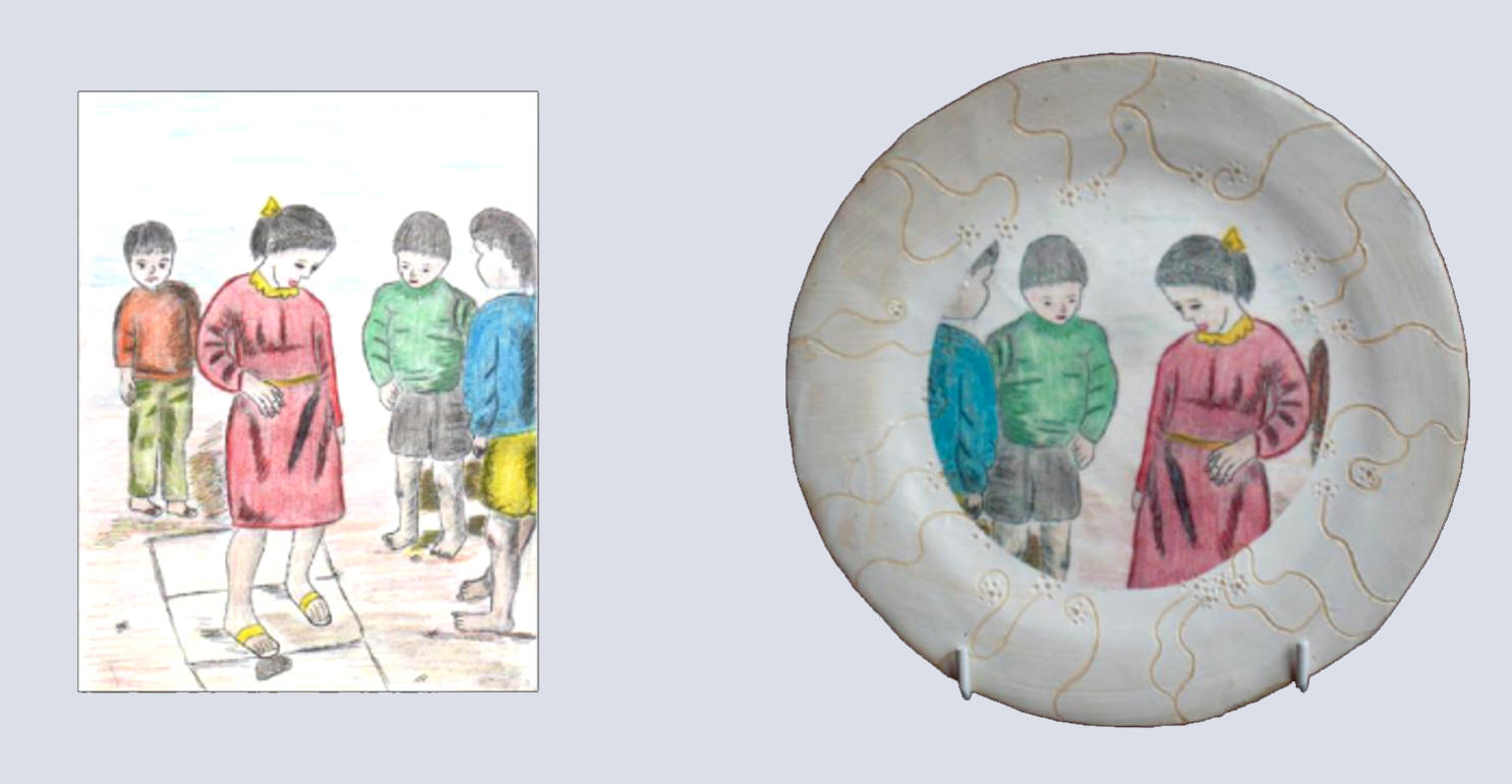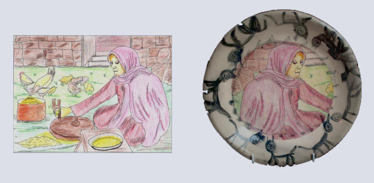 Zurück in London wählten die Schüler der CCHS 21 Bilder aus, die sie auf Keramikplatten übertrugen, die sie im Rahmen von Töpferkursen und außerschulischen Aktivitäten hergestellt hatten. Einige zeigten Palästinenser, die Wasserkrüge tragen, Brot backen und Linsen, Bohnen und Kichererbsen mahlen. Andere zeigten Fischer mit ihrem Fang, Arbeiter bei der Olivenernte und Kinder, die mit Murmeln spielen.