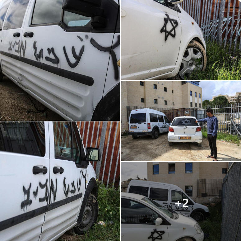 Israelische Extremisten sprühten heute rassistische Graffiti auf palästinensischen Fahrzeugen im besetzten Jerusalems Sheikh Jarrah. |