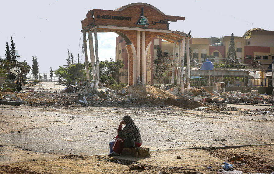 Eine palästinensische Frau sitzt vor dem beschädigten Eingang der Al-Aqsa-Universität in Khan Younis im südlichen Gazastreifen, 26. Januar 2024. (Atia Mohammed/Flash90)