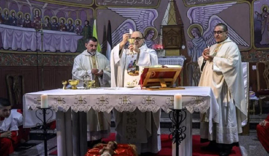 Pater Gabriel Romanelli, Pfarrer der römisch-katholischen Kirche der Heiligen Familie, spendet die Kommunion während der Heiligabendmesse in der Kirche im Viertel Zaytoun in Gaza-Stadt am 24. Dezember 2024