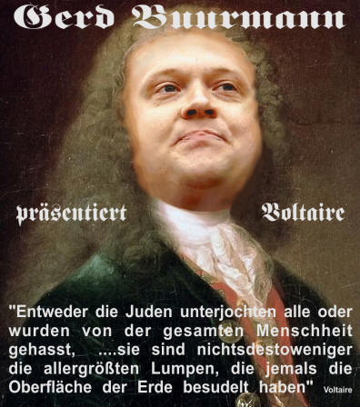 "Ihr seid berechnende Tiere", hielt Voltaire den Juden vor, "bemüht euch darum, denkende Tiere zu werden." Mit diesem Vergleich zwischen dem denkenden Christen und dem berechnenden Juden nimmt Voltaire die Grundvoraussetzung des rassistischen Antisemitismus eindeutig vorweg, weil hier die Annahme aller Antisemiten und Rassenfanatiker von der angeblichen Überlegenheit der schöpferischen Intelligenz der Christen über den unfruchtbaren Intellekt der Juden anklingt. In einem anderen Text versteigt sich Voltaire zu der Behauptung, dass die Juden "in jedem Bereich alles abschreiben oder nachmachen." In seiner "Abhandlung über die Sitten" bemerkt er(fälschlicherweise übrigens), dass man im alten Rom die Juden mit dem gleichen Blick betrachtet habe, "mit dem wir die Neger sehen,nämlich als eine minderwertige Menschenart", und weiter: "Alles ist bei den Juden widersprechend und inkonsequent, wie fast bei allen Nationen. Das bringt die menschliche Natur mit sich. Aber das Volk der Juden übertrifft darin alle Menschen". Das Phantom von der jüdischen Weltverschwörung, mit dem Judenfeinde heute noch hausieren gehen, hat Voltaire auf eine kurze Formel gebracht:"Entweder die Juden unterjochten alle oder wurden von der gesamten Menschheit gehasst, ....sie sind nichtsdestoweniger die allergrößten Lumpen, die jemals die Oberfläche der Erde besudelt haben."