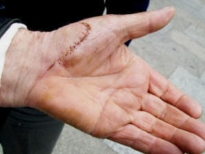 Am 17.5.2012 wurde Walter Herrmann an der Kölner Klagemauer mit einem Messer angegriffen, und an der linken Innenhand erheblich verletzt! - Klaus Franke