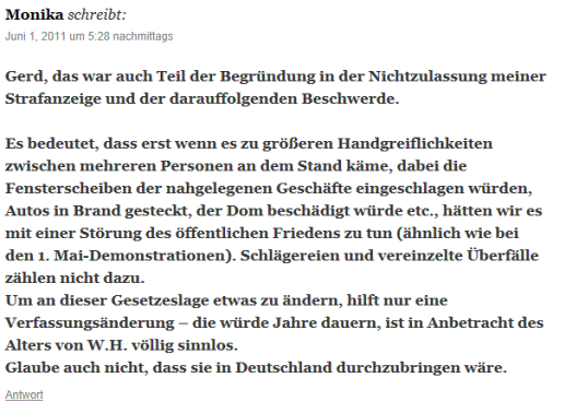 20.5.2012 Aktuelle Kommentare auf den Seiten des Gerd BuurmannGerd Buurmann und seine Besucher haben anscheinend nichts dazugelernt. Dieser Aristobulus (auch ein übler Hetzer) verweist in einem Link auf einen Artikel der eindeutig (so bestätigt auch der Autor) auf Gewalthandlungen hinweist. Was muss noch passieren?