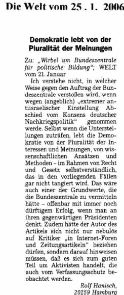 Man sollte das Schlusszitat von CDU-Politikerin Köhler genau lesen und sich fragen, ob Ludwig Watzal nicht mehr als irgendjemand anderes diesen Auftrag erfüllt: "Die Bundeszentrale für politische Bildung hat als Leitbild aufgetragen bekommen, das demokratische Bewußtsein in der Bevölkerung zu fördern. Es ist nicht der Ort, um falsche Ideologien zu verbreiten", sagte sie der WELT. - Eine Medienkritik von Anis Hamadeh