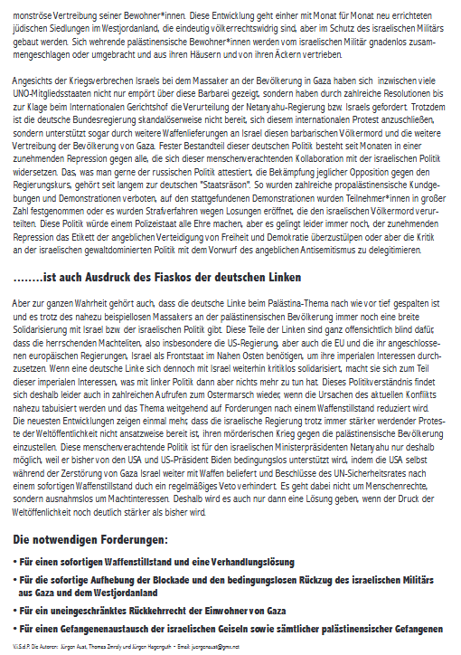 Nach obenFotoausstellung - Ursula MindermannFotoreportage Detlef Lampe - ShatilaGaza-Flyer und PostkartenAndreas Splett - Fotos aus Ramallah - 1Andreas Splett - Fotos aus Ramallah - 2Bildersammlungen ExternBilder - CheckpointBeit Hanun 8.11.06Bilder Checkpoint Jerusalem - ArbeiterDestruction 1Destruction 2Dschenin - BilderDeir Yassin Massaker - 9.4.1948 - FotosOlivenernteSchicksaleSo entsteht HassSoldaten kommenSoldaten sind daSoldaten waren daIsrael greift Libanon an - 2006 - Bilder 1Israel greift Libanon an - 2006 - Bilder 22006 - Libanon - Massaker in KanaRafah - Vertreibung - 19. Mai 2004WohnqualitätKarneval der Kulturen in Berlin 2012
