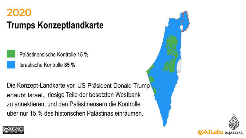 Am 28. Januar 2020 kündigte US-Präsident Donald Trump formell seinen Nah-Ostplan an, um den sieben Jahrzehnte anhaltenden israelisch-palästinensischen Konflikt zu lösen. Er pries ihn als „Jahrhundertdeal“. Als Teil des Plans präsentierte er eine Konzept-Landkarte, die Israel erlauben würde, riesengroße Teile der besetzten Westbank zu annektieren, und den Palästinensern eine Kontrolle über nur 15 % des historischen Palästinas einräumen würde.
