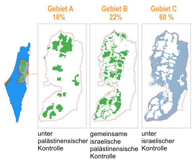 1993 und 1995 Oslo-Abkommen Die Oslo-Abkommen stellten die erste direkte palästinensisch-israelische Friedensvereinbarung dar. Sie führte zu der Gründung der Palästinensischen Autorität (PA) – einer Verwaltungsbehörde, die für eine Übergangszeit von 5 Jahren die palästinensische innere Sicherheit, und Adminstrativ- und Zivilangelegenheiten in den selbstverwalteten Gebieten leitet. Vor Ort wurde die besetzte Westbank in drei Gebiete aufgeteilt: A, B und C. Gebiet