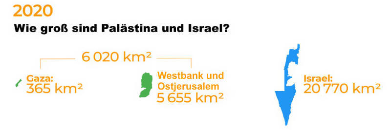 Zusammen umfassen die palästinensischen und israelischen Gebiete 26 790 km². Das ist ungefähr die Größe des US-Staates Hawaii (28 313 km²), der karibischen Nation Haiti (27 750 km²) oder von Albanien in Europa (28 748 km²). Auf palästinensischer Seite haben die besetzten Gebiete, die Gaza, Westbank und Ostjerusalem umfassen, eine Oberfläche von 6 020 km². Israel hat eine Oberfläche von 20 770 km², die auf den international anerkannten Grenzen der Grünen Linie beruht.