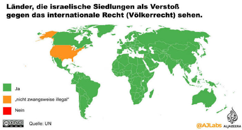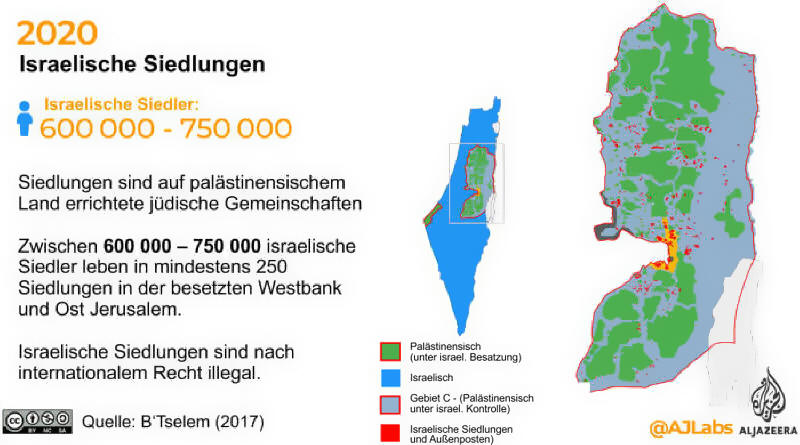 Israelische Siedlungen sind jüdische Gemeinschaften, die auf palästinensischem Gebiet errichtet wurden. Es gibt zwischen 600 000 – 750 000 israelische Siedler, die in mindestens 250 Siedlungen (130 offiziell, 120 inoffiziell) in der Westbank und Ostjerusalem leben. Israelische Siedlungen sind nach internationalem Recht illegal, da sie gegen die Vierte Genfer Konvention verstoßen, die einer Besatzungsmacht verbietet, ihre Bevölkerung in das von ihr besetzte Gebiet zu transferieren. 2019, unter der Präsidentschaft von Donald Trump, erklärte die USA, israelische Siedlungen auf besetztem palästinensischen Land seien „nicht zwangsläufig illegal“, ein dramatischer Bruch der seit Jahrzehnten praktizierten US-Politik.