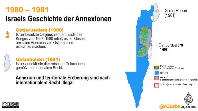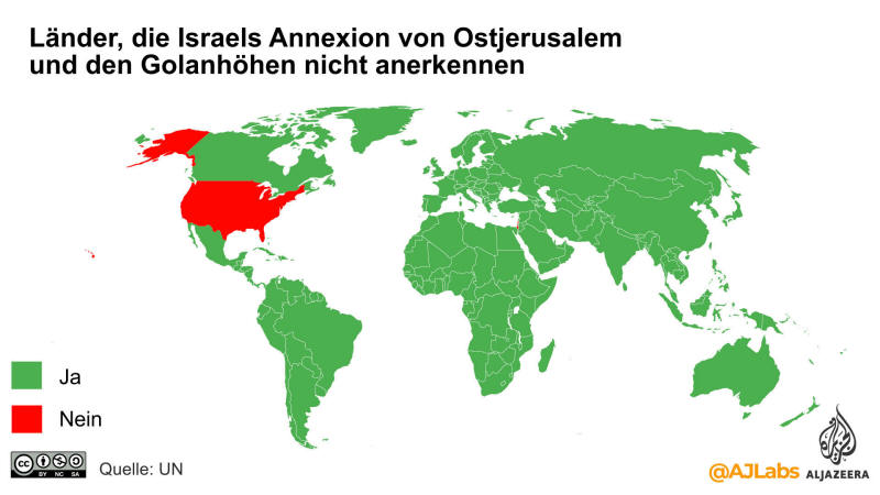 Ostjerusalem (1980) Golanhöhen (1981) Israel benutzt die Bezeichnung „Ausübung der israelischen Souveränität“ über Gebiete, die es annektiert hat. Annexion und territoriale Eroberung sind nach internationalem Recht illegal. 2019 erkannte die USA Israels Annexion der Golanhöhen an. Sie ist das einzige Land weltweit, das dies tut.