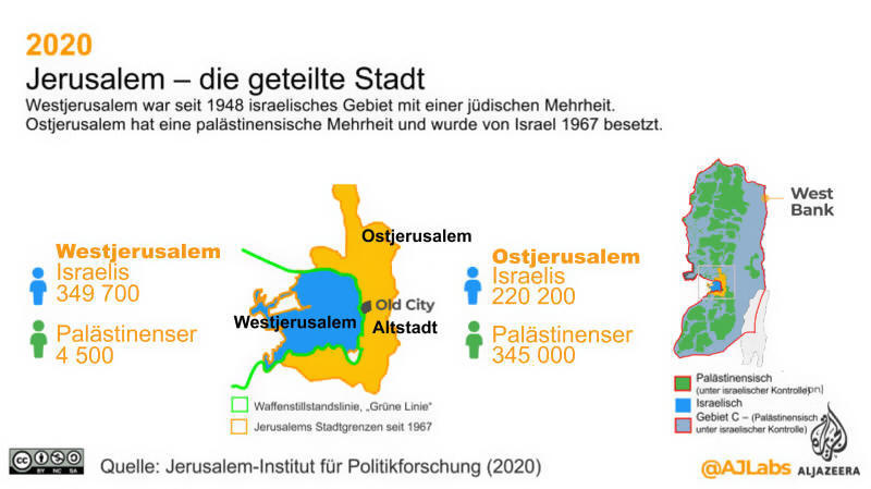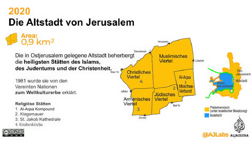 16. Jerusalem – die geteilte Stadt Gemäß internationalen Standards ist Jerusalem eine geteilte Stadt. Westjerusalem war israelisches Gebiet seit 1948, die Juden sind dort in der Mehrheit. Ostjerusalem hat eine palästinensische Mehrheit und wurde von Israel 1967 besetzt. Seit seiner Annexion 1980 betrachtet Israel die gesamte Stadt Jerusalem als Teil seines Gebiets. Das ist international jedoch nicht anerkannt. Aus diesem Grund zeigen israelische Landkarten Ostjerusalem nicht als Teil der besetzten Westbank.