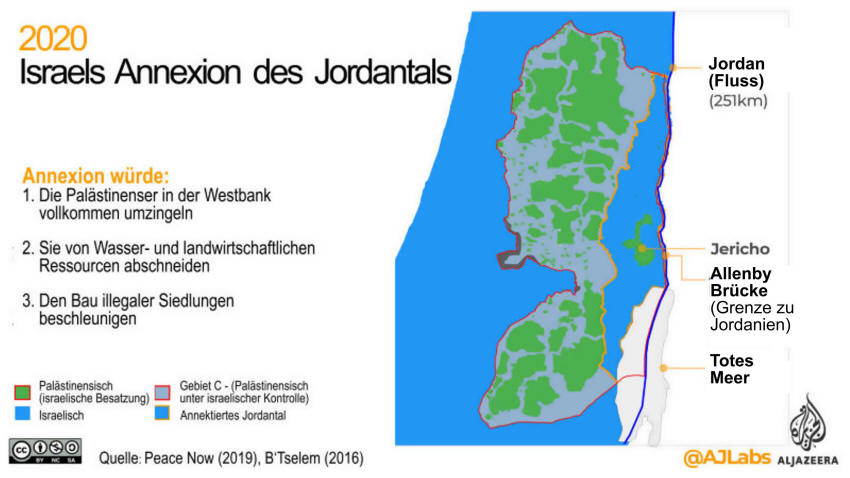 Israels Annexion des Jordantals Die am 1. Juli von Netanyahu erwartete Annexion des Jordantals ist aus einer Reihe von Gründen bedeutend: 1. Die Palästinenser würden vollständig umzingelt Die einzige internationale Grenze der Westbank ist die mit Jordanien. Wenn Israel das Jordantal annektierte, würde die Westbank von Israel völlig umzingelt. Für die Palästinenser kann es keinen palästinensischen Staat ohne das Jordantal geben. 2. Sie wären von palästinensischem Wasser und landwirtschaftlichen Ressourcen abgeschnitten Israelische Siedler erhalten im Jordantal 18 mal mehr Wasser im Durchschnitt als die palästinensischen Bewohner der Westbank. Die meisten palästinensischen Bauern sind nicht mit dem Wassernetzwerk verbunden und müssen sich auf gekauftes Wasser aus Tanks verlassen. Die Annexion würde bedeuten, dass die Palästinenser physisch vom Jordanfluss abgeschnitten wären. 3. Sie würde den Siedlungsbau beschleunigen Derzeit erfordert jede neue Zoneneinteilung oder jeder neue Bau in der Westbank die Genehmigung von Israels Verteidigungsminister und Premierminister. Das kann Monate oder Jahre dauern. Nach der Annexion würde Israel das Jordantal als Teil seines Gebietes betrachten und somit wäre jede Konstruktion eine lokale Angelegenheit. Nach einer von Netanyahu in 2019 präsentierten Karte umfassten die zu annektierenden Gebiete 95 Prozent des Jordantals, was mindestens 22 Prozent der Westbank ausmacht.