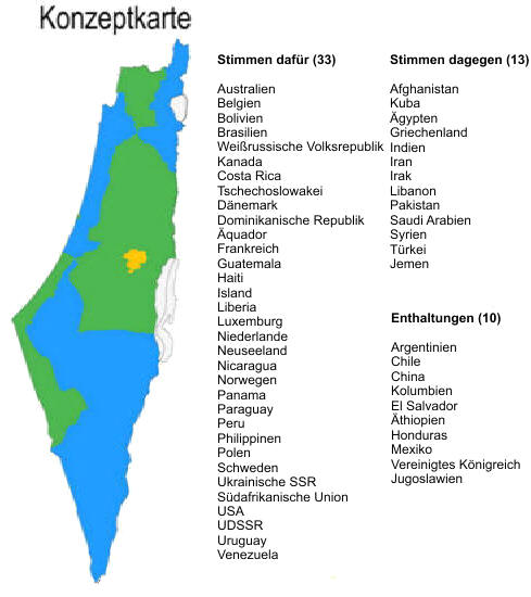 UN-Teilungsplan Die Palästinenser lehnten den Vorschlag ab, weil er einen Großteil des Gebietes, das unter ihrer Herrschaft stand, wegnahm. Damals besaßen sie 94 Prozent des historischen Palästinas und bildeten 67 Prozent der Bevölkerung. Dieser Plan wurde nie vor Ort umgesetzt.