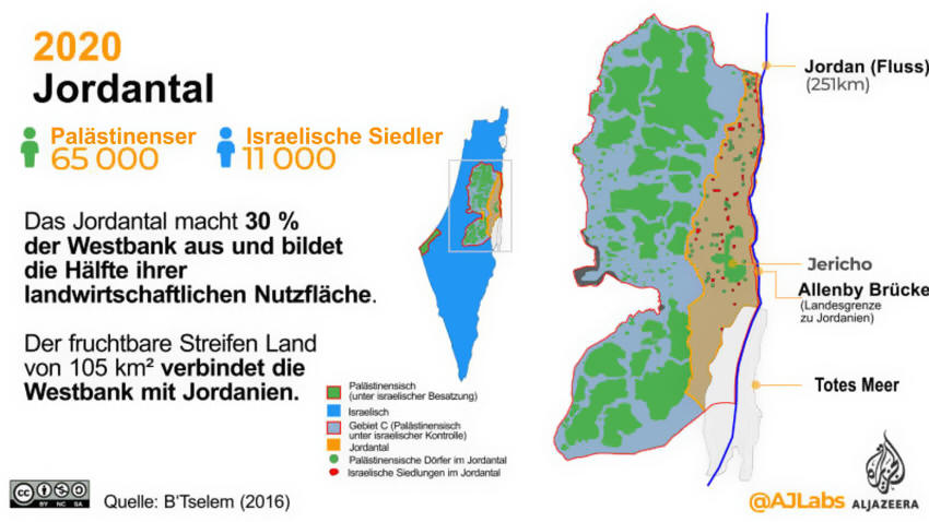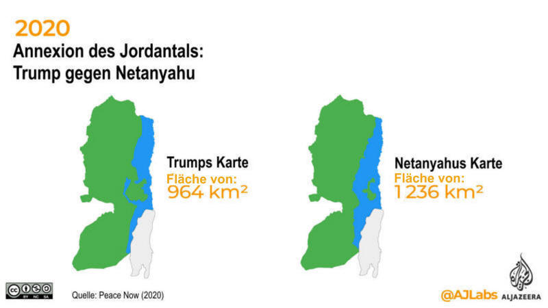 Annexion des Jordantals: Trump gegen Netanyahu Laut dem israelischen Siedlungs-Watchdog Peace Now ist das Gebiet, das der israelische Premierminister Bejamin Netanyahu plant, von dem Jordantal zu beschlagnahmen, größer als das Gebiet, das in Trumps Plan 2020 dargestellt wird. Nach Israels Berechnungen würde es rund 1 236 km² Land des Jordantals beschlagnahmen. Laut Trumps Konzept-Landkarte, die er im Januar präsentierte, sollte Israel einen kleineren Teil des Jordantals annektieren, circa 964 km² .