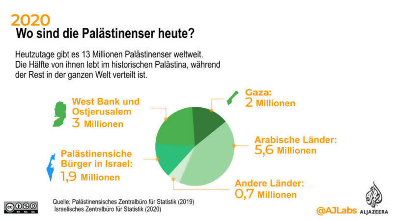 25. Wo sind die Palästinenser heute? Heutzutage gibt es 13 Millionen Palästinenser weltweit, laut dem Palästinensischen Zentralbüro für Statistik. Etwa die Hälfte der palästinensischen Bevölkerung lebt im historischen Palästina, dazu gehören drei Millionen in der Westbank und Ostjerusalem, zwei Millionen in Gaza und 1,9 Millionen palästinensische Bürger in Israel. Weitere 5,6 Millionen Palästinenser leben in arabischen Ländern wohingegen die restlichen 700.000 in anderen Ländern der Welt leben.