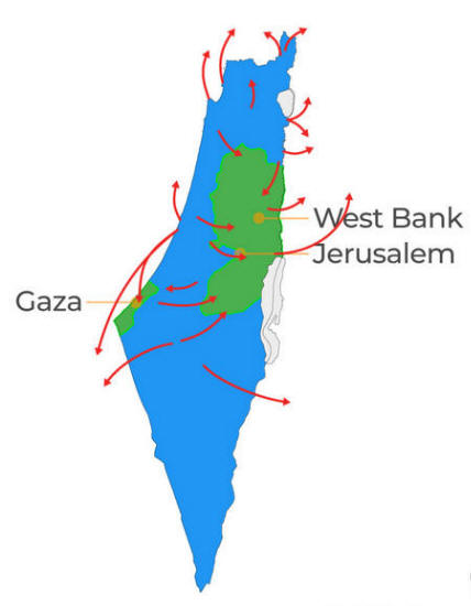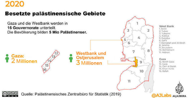 Der Gazastreifen ist ein kleines Küstengebiet, das im Süden an Ägypten grenzt. Für zwei Millionen Palästinenser ist dieses Gebiet die Heimat. Die Westbank ist das nierenförmige Gebiet im Osten. Sie liegt im Westen des Jordanufers (der Jordanbank), woher ihr Name stammt. Ostjerusalem liegt auf der palästinensischen Seite der Grünen Linie von 1949. Drei Millionen Palästinenser leben in der Westbank und Ostjerusalem.