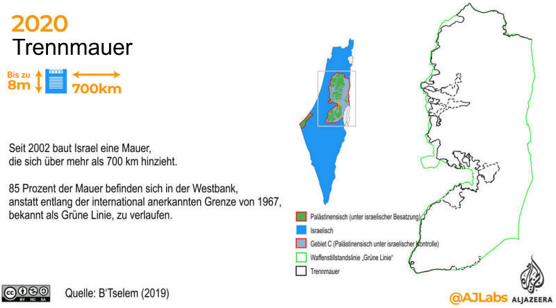 Trennmauer Seit 2002 baut Israel eine Mauer, die sich über mehr als 700 km hinzieht. Israel behauptet, die Mauer diene Sicherheitsgründen. Jedoch, anstatt der international anerkannten Grünen Linie zu folgen, verlaufen 85 Prozent der Mauer in der Westbank. Das schränkt die Freiheit der Bewegung für die Palästinenser erheblich ein.