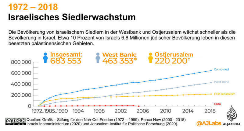 Die Bevölkerung der israelischen Siedler in der Westbank und Ostjerusalem wächst schneller als die Bevölkerung in Israel. Etwa 10 Prozent von Israels 6,8 Millionen jüdischer Bevölkerung leben in diesen besetzten palästinensischen Gebieten. Obwohl sie sich außerhalb des eigentlichen Israels befinden, wird diesen Siedlern die israelische Staatsbürgerschaft gewährt. Außerdem erhalten sie staatliche Unterstützungen, die ihre Lebenskosten erheblich minimieren. Seit 2020 wurden 463.535 in der Westbank lebende Siedler registriert .In Ostjerusalem waren es 220 000.