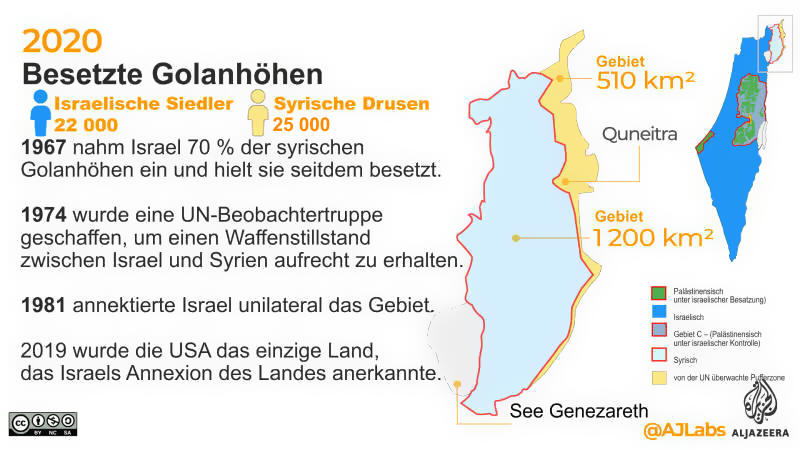 Besetzte Golanhöhen 1967 nahm Israel 70 Prozent der syrischen Golanhöhen ein und hält es seitdem besetzt. 1974 wurde eine UN-Beobachtertruppe geschaffen, um den Waffenstillstand zwischen Israel und Syrien zu erhalten. 1981 annektierte Israel unilateral das Gebiet. 2019 wurde die USA das einzige Land, das Israels Annexion des Landes anerkannte.
