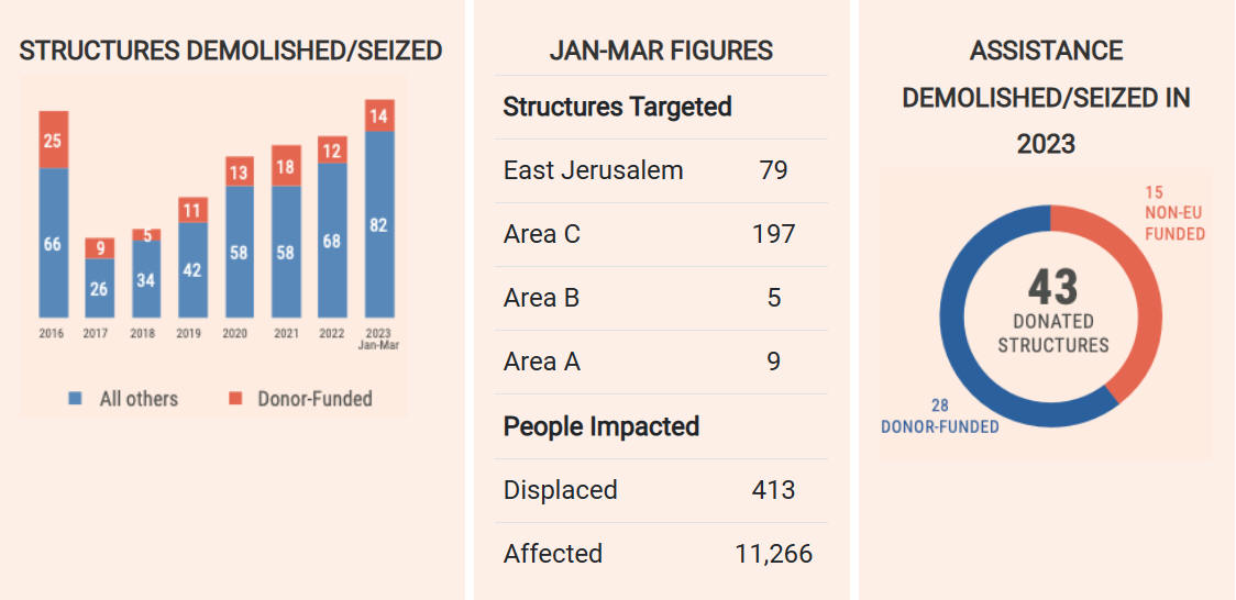 Die israelischen Behörden in Ostjerusalem und im Gebiet C der Westbank zerstörten, beschlagnahmten oder zwangen Menschen zur Selbstzerstörung von 23 Strukturen, darunter sieben Häuser, mit dem Hinweis auf fehlende von Israel ausgestellte Baugenehmigungen, die so gut wie gar nicht zu erhalten sind. Das Ergebnis ist, dass 17 Palästinenser, darunter acht Kinder, vertrieben wurden, und die Lebensgrundlagen von 100 weiteren beeinträchtigt wurden. Eine der betroffenen Strukturen wurde von Gebern als humanitäre Hilfe bereitgestellt. Sechszehn Strukturen wurden im Gebiet C zerstört, darunter 12, alle bei einem einzigen Vorfall in Anata Stadt (Jerusalem. Die restlichen sieben Strukturen wurden in Ostjerusalem zerstört, was zur Vertreibung von drei Haushalten führte, insgesamt 12 Menschen, darunter fünf Kinder. Vier der sieben in Ostjerusalem zerstörten Strukturen wurden von ihren Eigentümern selbst zerstört, um die Zahlung von Gebühren an die israelischen Behörden zu vermeiden.