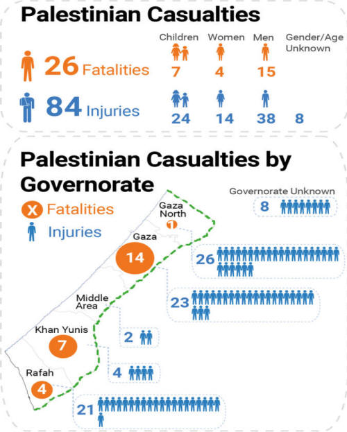 Auch im Gazastreifen eröffneten in mindestens 22 Fällen israelische Streitkräfte ein „Warnfeuer“ in der Nähe von Israels Trennzaun vor der Küste. Bei diesen Vorfällen wurden vier Fischer verletzt, zwei weitere wurden verhaftet und ein Fischerboot wurde beschlagnahmt. Während der Berichtszeit wurden 173 Palästinenser, darunter mindestens 58 Kinder, von israelischen Streitkräften in der gesamten Westbank verletzt, darunter 11, die von scharfer Munition verletzt wurden.