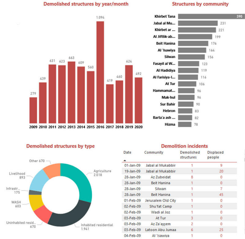 Die israelischen Behörden zerstörten, beschlagnahmten oder zwangen Menschen zur Zerstörung von 56 Strukturen in Ostjerusalem und in Zone C der Westbank, darunter sechs Häuser, mit dem Vorwand fehlender von Israel ausgestellten Baugenehmigungen, die jedoch kaum zu erhalten sind. Das Ergebnis war, dass 23 Palästinenser, darunter 12 Kinder, vertrieben und die Lebensgrundlagen von mehr als 3.500 weiteren beeinträchtigt wurden.