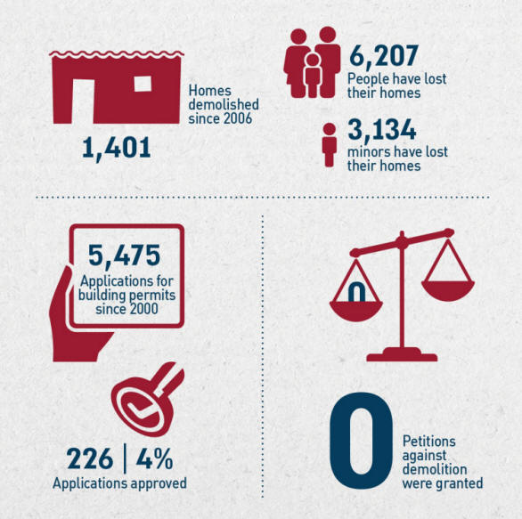 Anträge auf Baugenehmigungen: Nach Angaben der Zivilverwaltung haben Palästinenser von Januar 2000 bis Mitte 2016 5.475 Anträge auf Baugenehmigung gestellt. Nur 226 (ca. 4%) wurden gewährt.