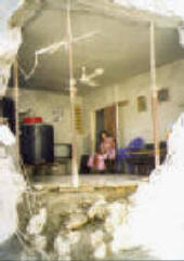 eine alte Frau in ihrem zum Ground Zero hin zerstörten Wohnzimmer-