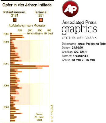Zahl der monatlich getöteten Palästinenser und Israelis seit Beginn der Intifada am 28. September 2000.