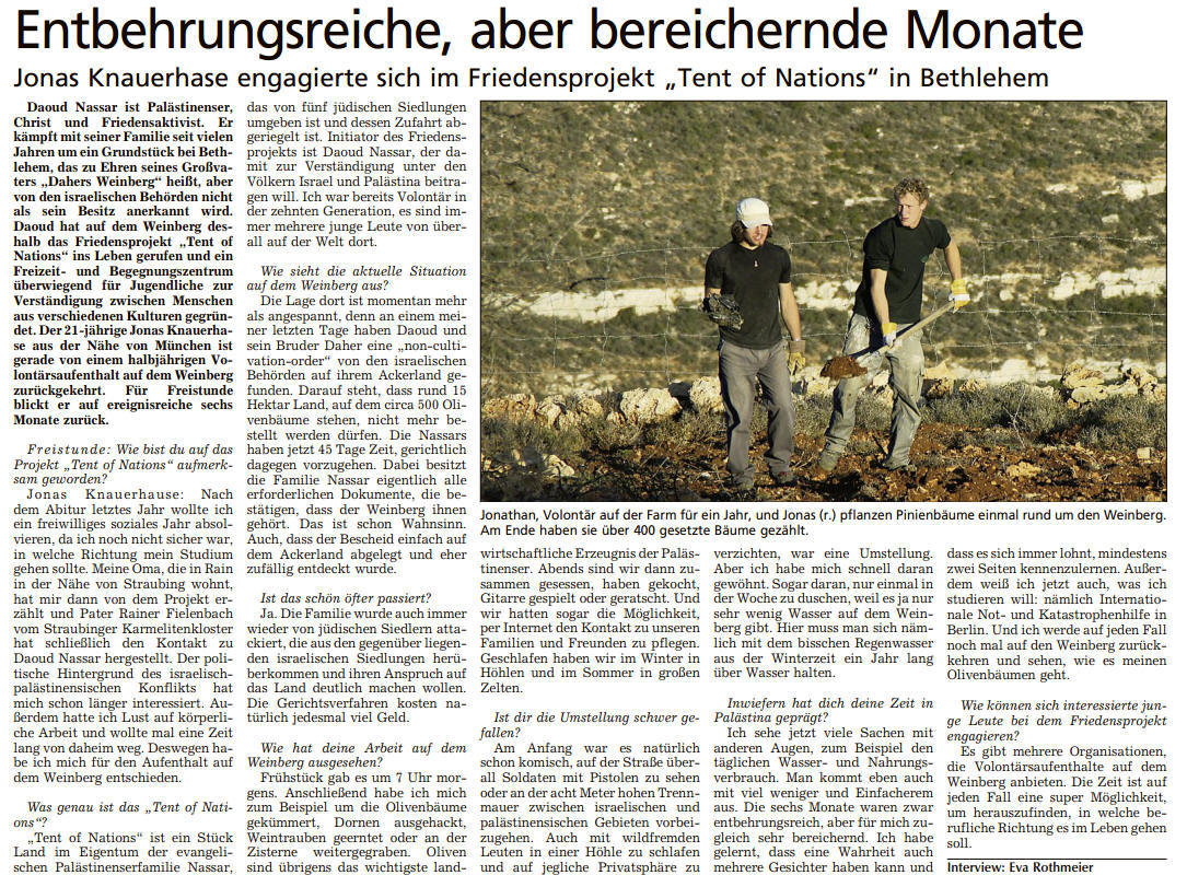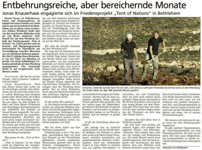 Auf dem Gelände des Friedensprojektes „Zelt der Völker“, dem Berg Daher, ist es zu einer geradezu wahnwitzigen Zerstörung von 1500 – ich hörte aus anderer Quelle von 800 – Apfel- und Aprikosenbäumen gekommen. Nach Mitteilung von Agenturen hätten israelische Bulldozer diese Bäume sowie Weinstöcke am 19. Mai zerstört. Der Leiter und Besitzer des Berges Daher Daoud Nassar hat diese Zerstörung bestätigt. Der Anwalt der Familie prüfe das weitere Vorgehen. In zwei Tagen soll Daoud Nassar, der auf Vorträgen in den USA ist, wieder in Bethlehem und auf dem Berg sein.