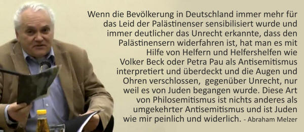 Diese Frage stellt sich und ist mit dem Hinweis auf Charlotte Knoblauchs Schmähungen und Verleumdungen leider nicht befriedigend zu beantworten. Sie wirft den Veranstaltern und mir vor, wir würden Israel „delegitimieren“, Israel bezogenen Antisemitismus verbreiten – was immer das auch sein soll – und gegen Israel agitieren und Antisemitismus ganz allgemein propagieren. Wenn das nicht so traurig wäre, und wenn es nicht solche gravierende Konsequenzen hätte, zum Beispiel für mich, könnte man lachen. Mich nannte Knobloch: „Abi Melzer ist für seine antisemitischen Äußerungen regelrecht berüchtigt.“