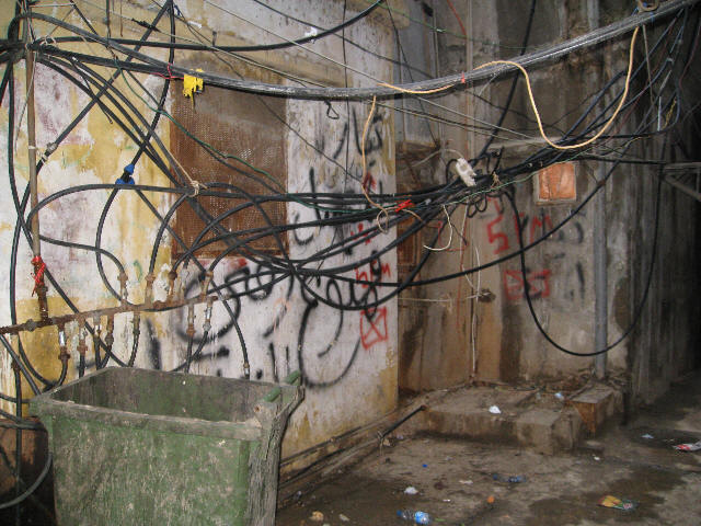 Elektrikers vor. Manche Leitungen hängen mit blanken Enden herum, eine