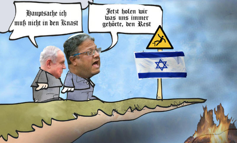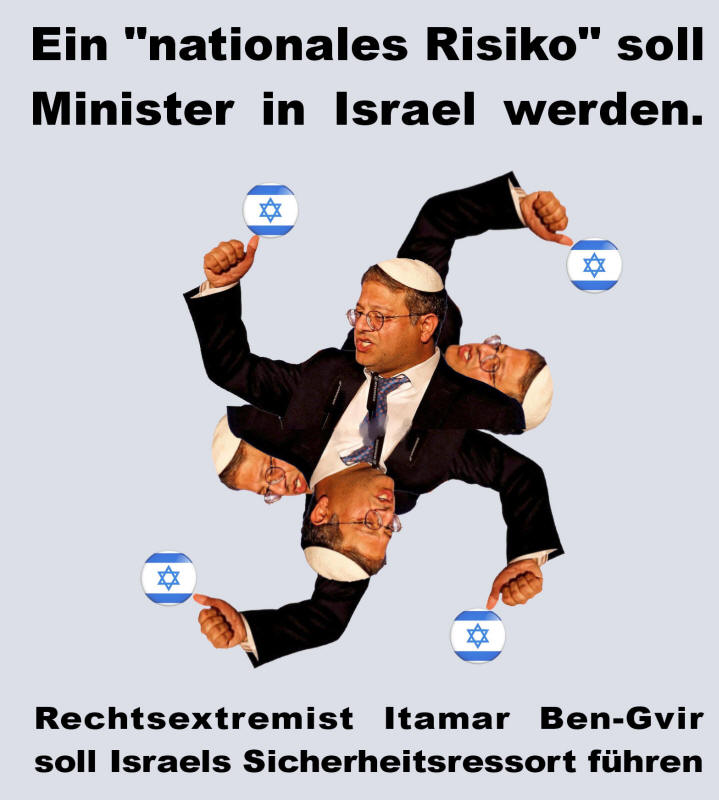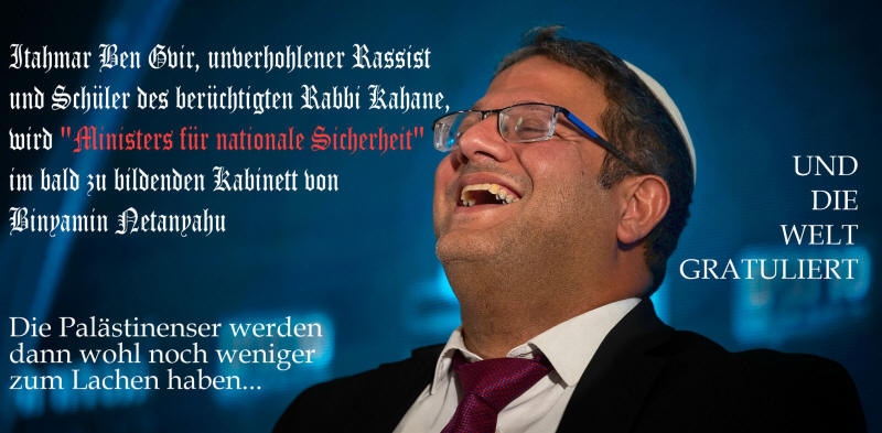 Israels neue Koalition - die am weitesten rechts stehende in der Geschichte des Landes - steht fest. Benjamin Netanjahu wird als Premierminister in die Balfour Street zurückkehren. Bezalel Smotrich, Vorsitzender der Partei des Religiösen Zionismus, wird Finanzminister mit einem erweiterten Zuständigkeitsbereich für Israels Verwaltungsorgane im besetzten Westjordanland; und sein Gegenkandidat, Itamar Ben Gvir von Otzma Yehudit (Jüdische Kraft), wird Minister für nationale Sicherheit mit Zuständigkeit für die Polizei auf beiden Seiten der Grünen Linie - eine Rolle, die speziell für ihn geschaffen wurde.